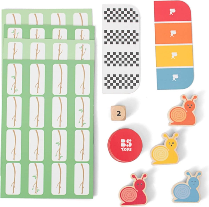 Welke slak is het snelst? Blad voor blad schuiven de slakken vooruit op het bord. Maar wees voorzichtig, een kaart kan je van plaats laten wisselen met een andere slak of je kunt een bruin blad krijgen waardoor je langzamer vooruitgaat. Een simpel en leuk bordspel voor het hele gezin!